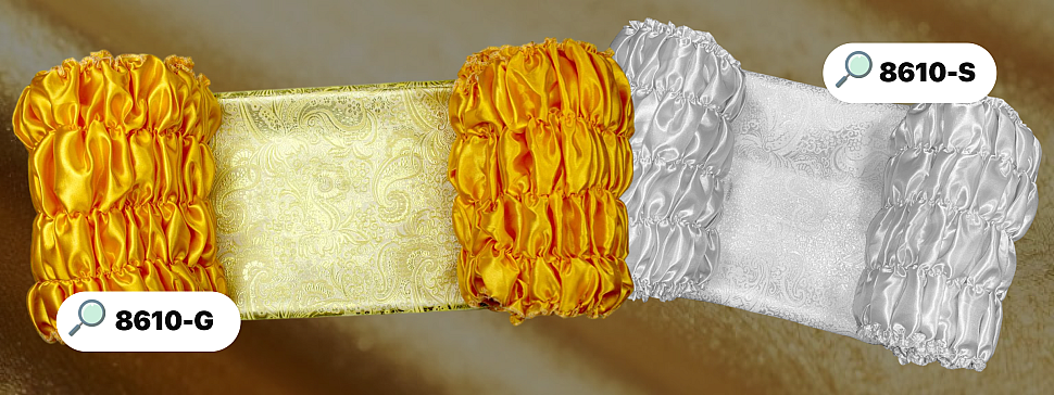 Драпированные, прошитые нитью с резинкой. Благодаря этому они легко подстраиваются под различную высоту гроба. Крупные складки создают объём и благородный вид. |