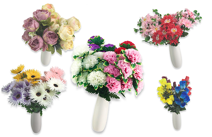 Искусственные цветы — основа любой ритуальной композиции. Они долговечны, не требуют ухода и сохраняют красоту в любую погоду. В нашем ассортименте представлены букеты искусственных цветов от бренда FITTONE на любой вкус. Это розы, гвоздики, пионы, лилии, герберы, георгины, астры, хризантемы, тюльпаны, нарциссы, ромашки, ландыши, орхидеи, каллы, маки, крокусы, колокольчики, бархатцы, анютины глазки, лаванда, сакура, хмель, брусника и многие другие виды. Все цветы представлены в разных форматах: готовые букеты с различным количеством головок, одиночные цветы на стебле, ветки с цветами и бутонами, а также ветки бутонов. Это позволяет флористам создавать композиции любой сложности, комбинируя готовые решения и отдельные элементы.